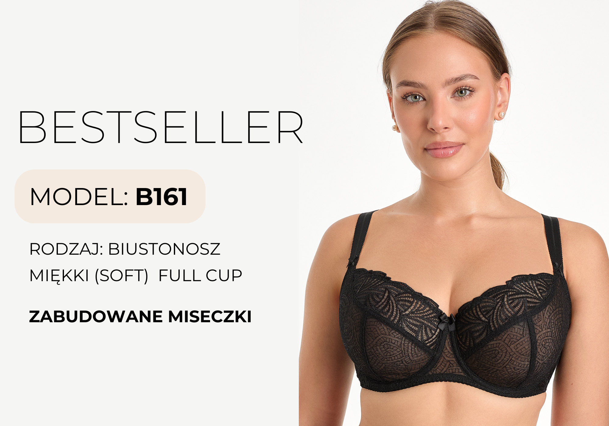 Model B161 to miękki biustonosz z fiszbinami idealny na średni i duży biust. Charakteryzuje się zabudowanymi miseczkami i wysokim mostkiem, z uwagi na te dwie cechy linia piersi oraz linia dekoltu są w znacznej mierze zasłonięte. Miseczki biustonosza są cięte w dwóch miejscach i kształtują piersi w kule. Model B161 znacznie unosi biust mocno kierując go do środka. Miseczki biustonosza w zależności od projektu są wykonane z ozdobnego haftu/tiulu lub koronki.