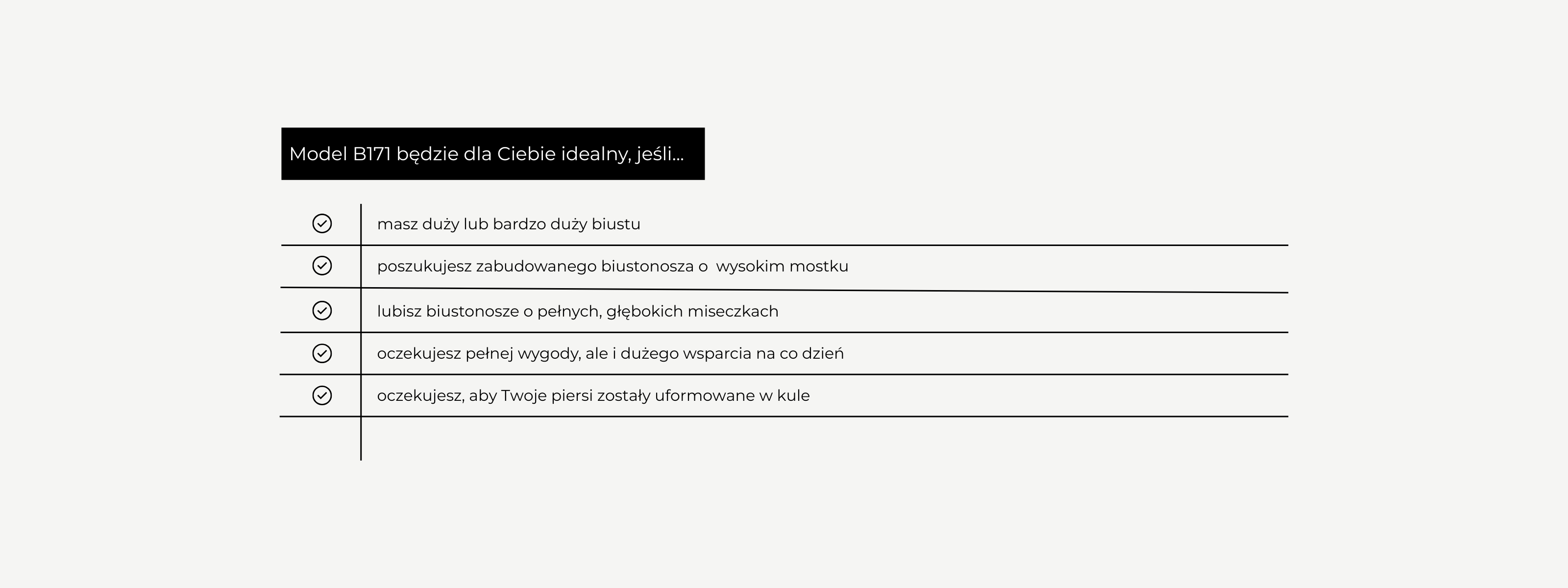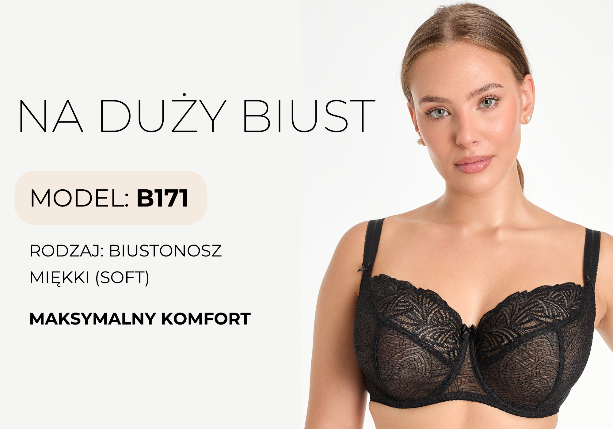 Model B171 to miękki biustonosz z fiszbinami dedykowany na duży i bardzo duży biust. Charakteryzuje się zabudowanymi miseczkami i wysokim mostkiem. Szczególnie głęboka konstrukcja miski i odpowiedni kształt fiszbiny idealnie obejmuje całą pierś zapobiegając wypadaniu biustu w niepożądanych miejscach kształtując go w atrakcyjne kule. Szerokie ramiączka zapewniają wygodę w noszeniu, a odpowiednio wysokie boczki stanowią dodatkowe wsparciu w podtrzymaniu biustu. Miski biustonosza w zależności od projektu wykonane są z ozdobnego haftu/tiulu lub koronki.