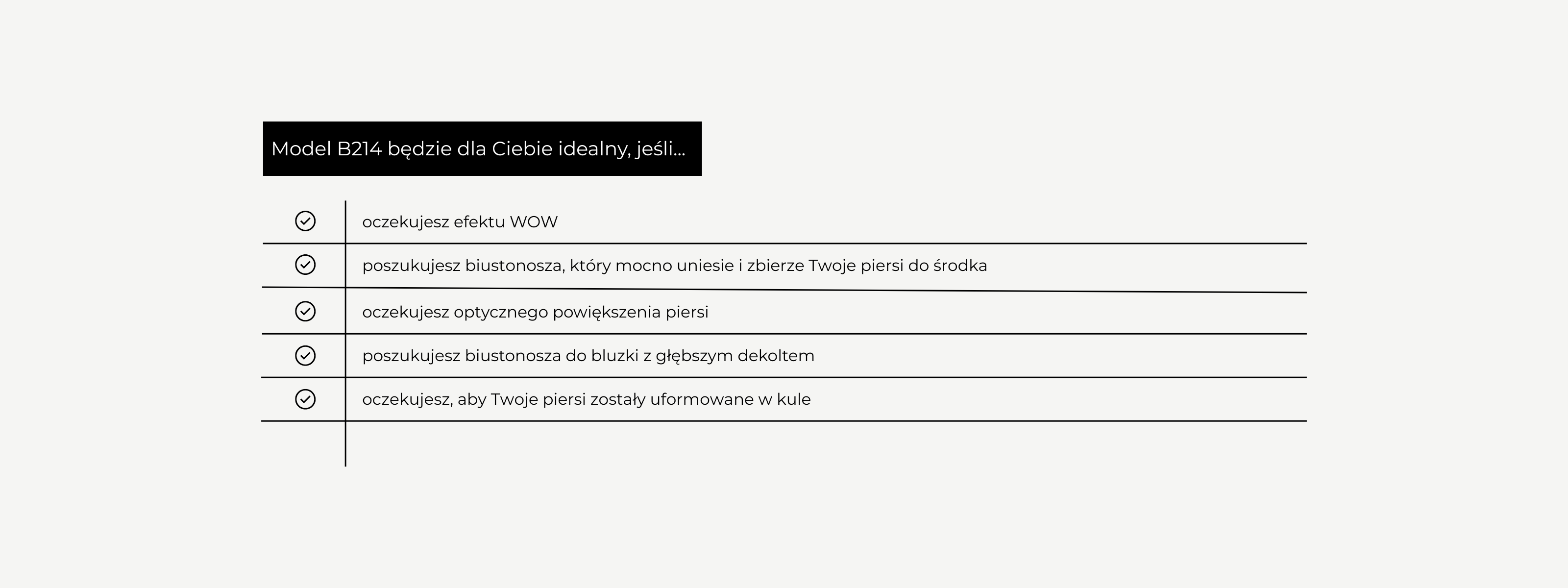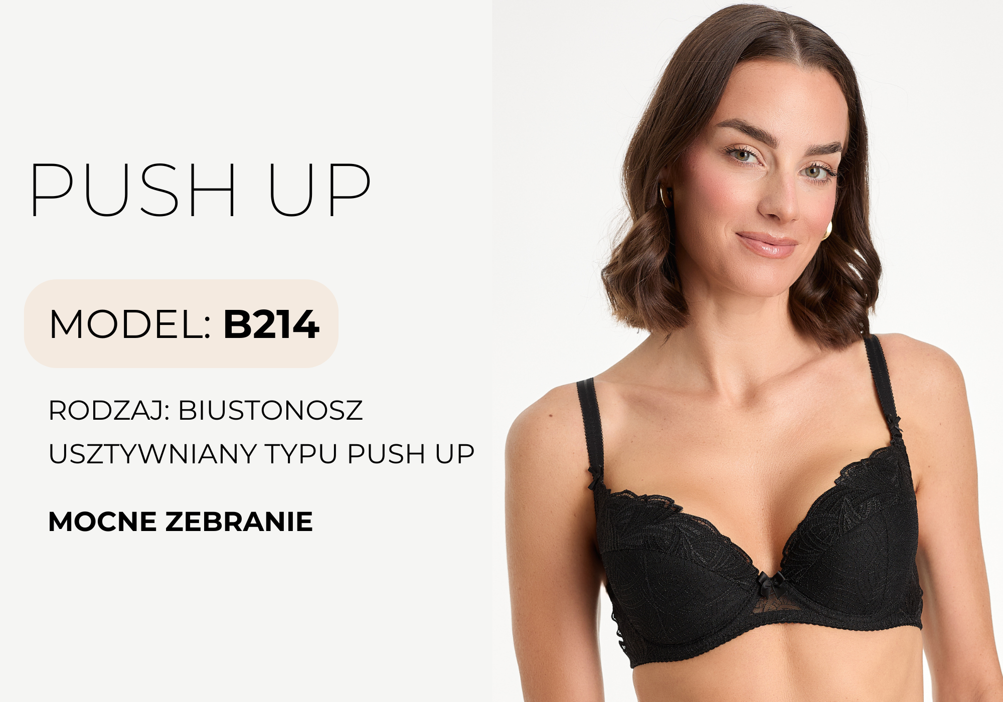 Model B214 to usztywniany biustonosz z fiszbinami na mały i średni biust. Model zbiera mocno biust do środka, dając efekt przedziałka między piersiami. Konstrukcja biustonosza w połączeniu z niskim środkiem sprawia, że linia dekoltu jest bardzo głęboka. Biustonosz typu push up jest w całości uszyty z pianki obszytej ozdobnym haftem/tiulem lub koronką. Model B214 posiada wewnętrzne kieszonki na wkładki powiększające, które pozwolą optycznie powiększyć piersi lub skorygować asymetrię biustu.