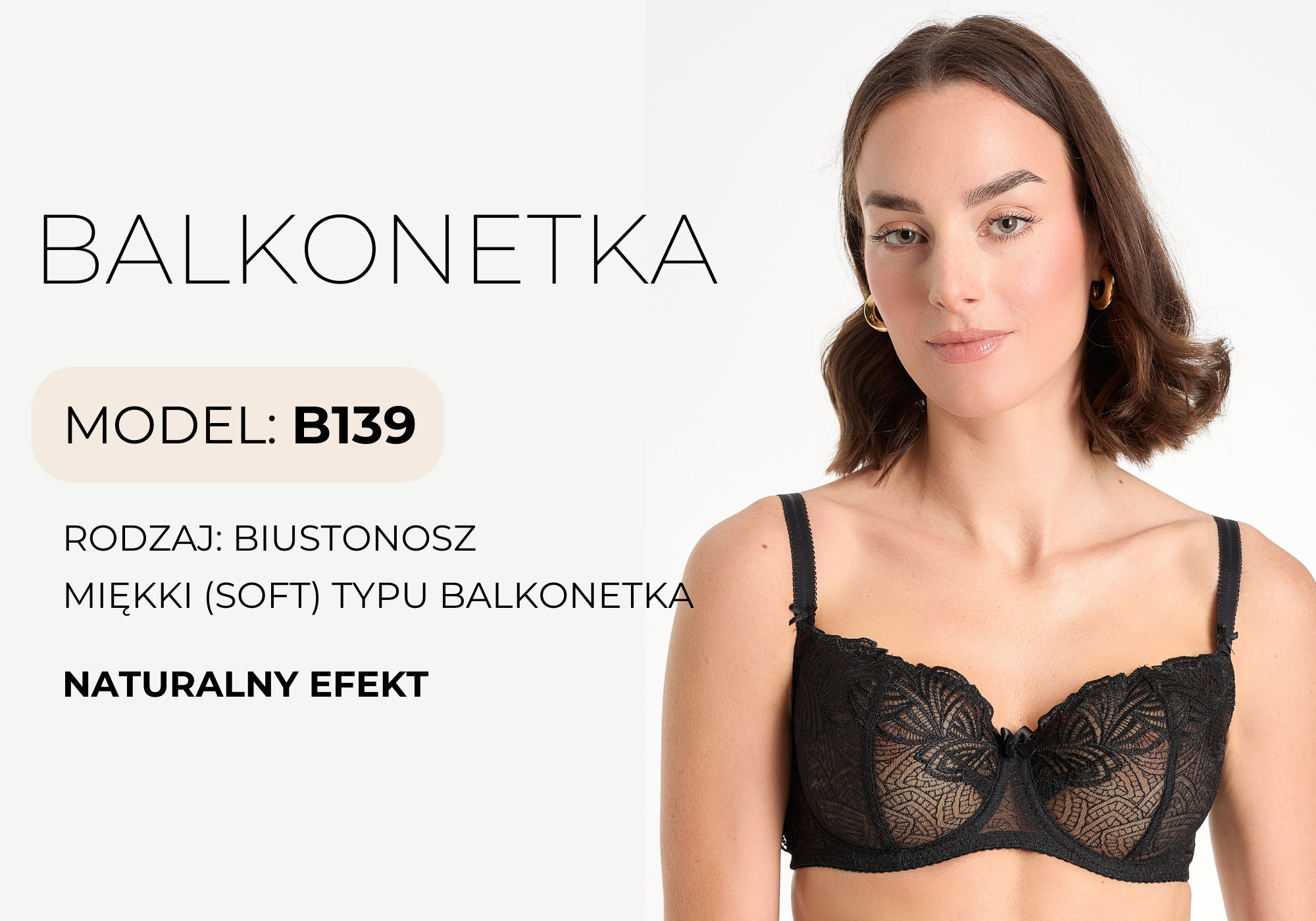 Model B139 to miękki biustonosz z fiszbinami idealny na mniejszy i średni biust. Jest to najbardziej uniwersalny model w ofercie marki Ewa Bien, który charakteryzuje się pojedynczym, pionowym cięciem miseczki. Model B139 subtelnie zbiera piersi do środka i delikatnie je unosi. Konstrukcja miseczek kształtuje piersi w kule, a średniej wysokości mostek umiarkowanie eksponuje linię dekoltu. Miseczki biustonosza w zależności od projektu wykonane są z ozdobnego haftu/tiulu lub koronki.