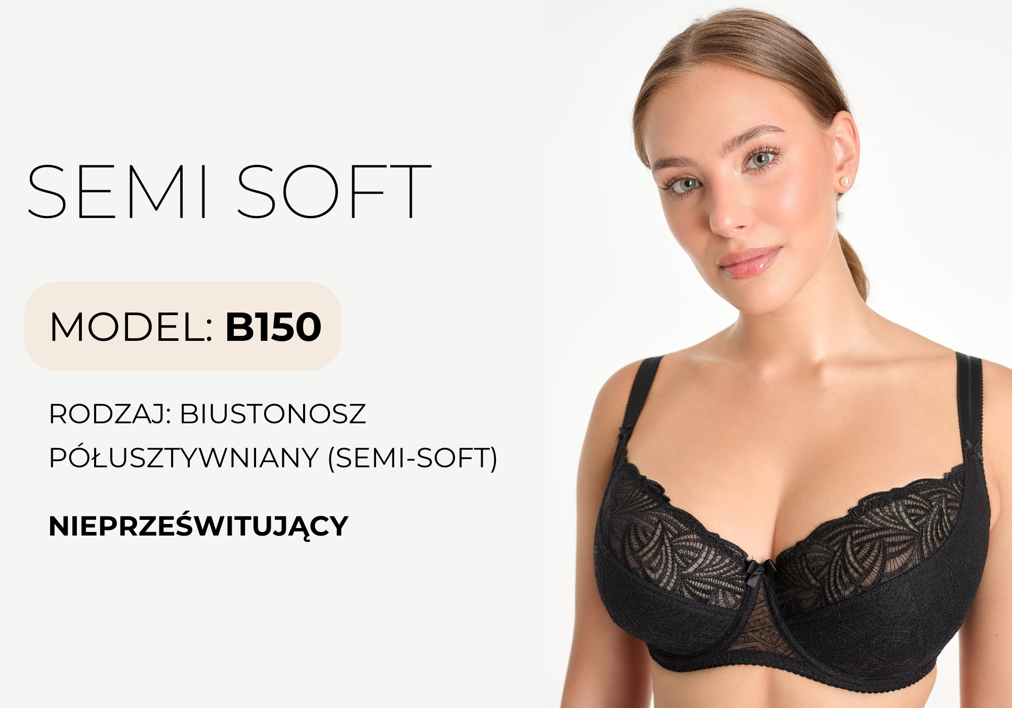 Model B150 to półusztywniany biustonosz z fiszbinami na średni i duży biust. Dolna część miseczek wykonana jest z pianki od wewnątrz pokrytej przyjemną bawełną, z kolei górna z pojedynczej warstwy ozdobnego haftu/tiulu lub koronki. Konstrukcja miseczek kształtuje piersi w kule, a średniej wysokości mostek umiarkowanie eksponuje linię dekoltu.