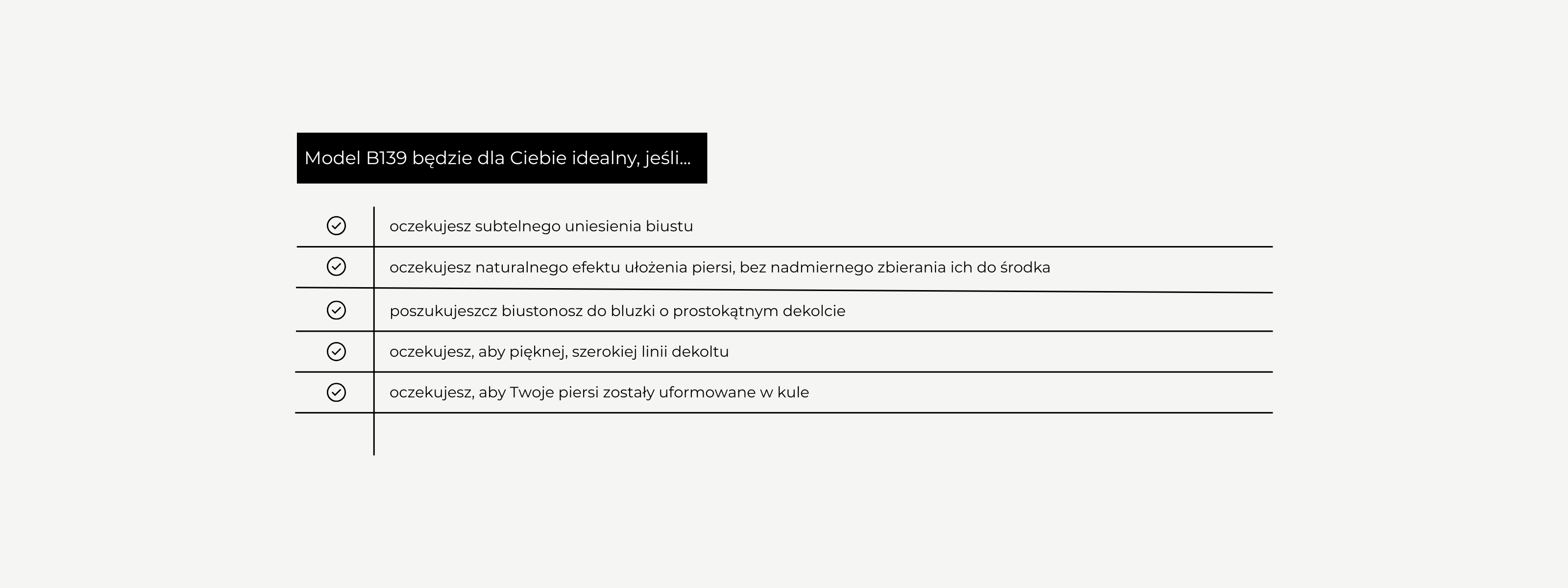 Model B136 to nowy model biustonosza powstały na bazie modelu B139. Jest to miękki biustonosz z fiszbinami idealny na mniejszy i średni biust. Charakteryzuje się dwoma pionowymi cięciami miseczki. Model B136 subtelnie zbiera piersi do środka i delikatnie je unosi. Konstrukcja miseczek kształtuje piersi w kule, a średniej wysokości mostek umiarkowanie eksponuje linię dekoltu. Miseczki biustonosza w zależności od projektu wykonane są z ozdobnego haftu lub koronki w zestawieniu z prześwitującym tiulem.