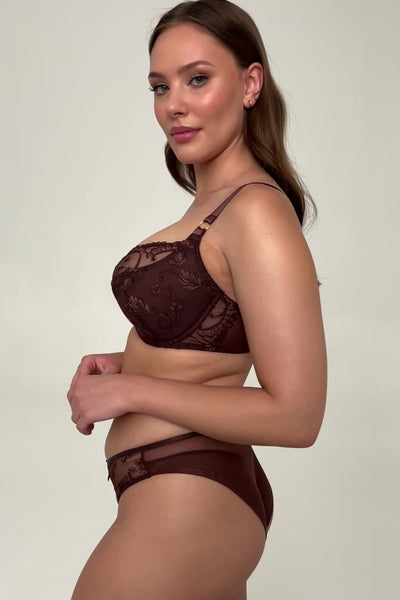 Czekoladowy – kolor, który od miesięcy króluje na wybiegach i w garderobach wielu kobiet. Teraz zagościł również na bieliźnie – w odsłonie pełnej klasy, zmysłowości i subtelnego ciepła. Głęboki odcień brązu otula ciało jak luksusowa tkanina, podkreślając naturalne piękno skóry. Delikatny haft dodaje lekkości, a całość tworzy wysmakowaną kompozycję dla kobiet, które cenią nowoczesną elegancję w najbardziej zmysłowym wydaniu. Kira to linia, która udowadnia, że bielizna może być jednocześnie modna, komfortowa i absolutnie uwodzicielska.